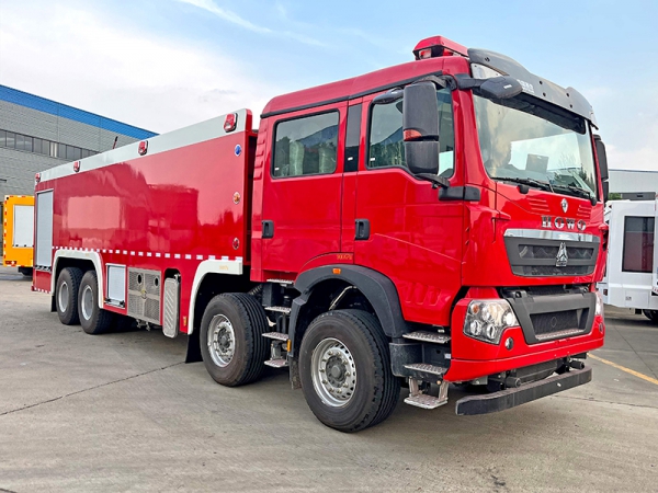 罐内设有不锈钢浮球式液位指示器,可通过仪表板上液位表显示罐内灭火剂的容量;罐底设带球阀的排污口,罐体设有 2 个76mm 溢流管,车厢两边各 2 个 76mm注入口,便于其他车辆供水加液之用。