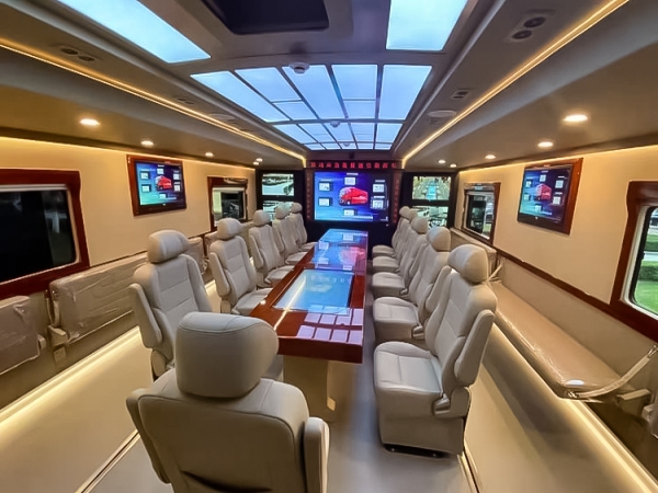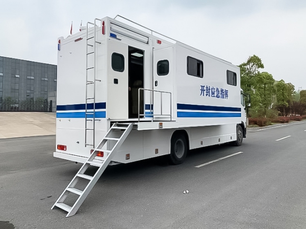重汽豪沃4*2底盘,车辆长度10630mm;车内配备9人会议桌椅,另配6个壁挂式折叠桌椅,厢体前面发电机仓与会议室隔开,厢体尾部为**室。厢体按空间区域分为前壁舱,乘、住区,卫生间。
