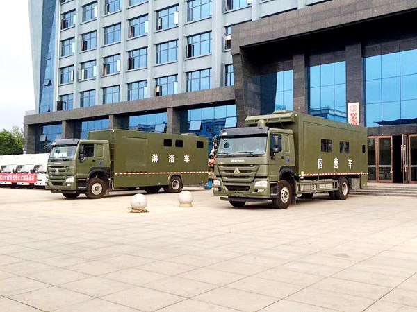 重汽豪沃底盘、箱体、净水箱、柴油热水锅炉、顶置空调换气扇、衣柜、鞋柜、卫生间及淋浴系统、空气加热器、精密水过滤器、避雷针、配电及**系统、逆变器、干粉迷惑器、5KW车载式发电机等。