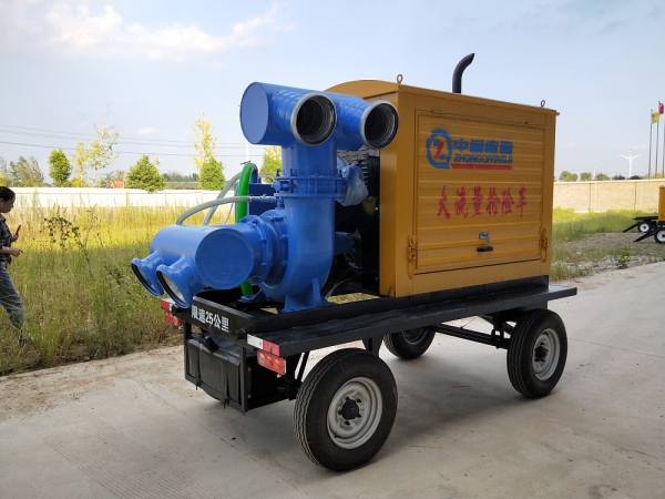 大流量节能拖挂式防洪抢险泵车使用柴油机带动自吸泵:该泵组集自吸和无堵塞排污于一体,采用柴油机驱动轴向回流外混式,并通过泵体、叶轮流道的设计,使用时不需要安装底阀和灌引水。泵组可吸排含有大颗粒固体和长纤维杂质液体,可广泛适用于市政排污及防涝工程、农业灌溉等。该泵组具有结构简单、自吸性能好、排污能力强、节能、使用维修方便、一体式户外型可移动设计等特点。